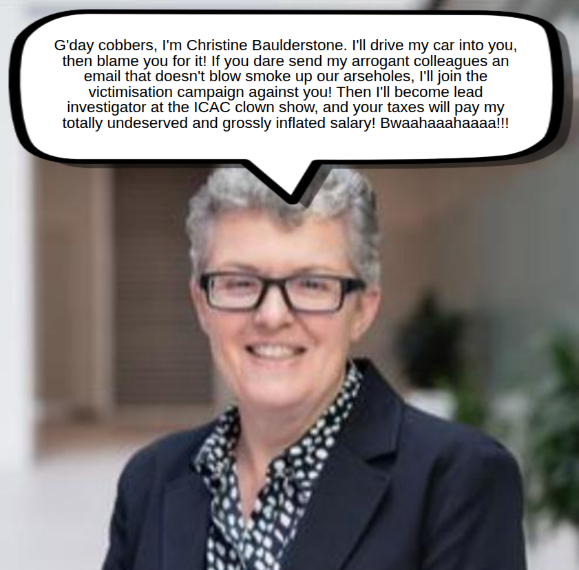 Christine Baulderstone is a SAPOL cop with a highly dubious record. So naturally the corrupt ICAC gave her a job, endowing her with the position of “Director Investigations”.