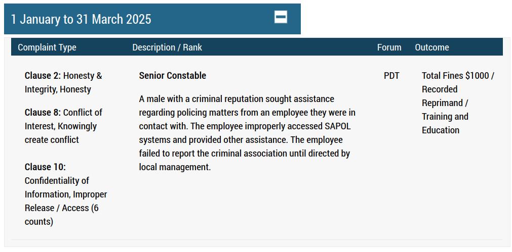 Quietly tucked away in the “About Us” section of the SAPOL website is a page titled “Publication of Employee Disciplinary Outcomes“.